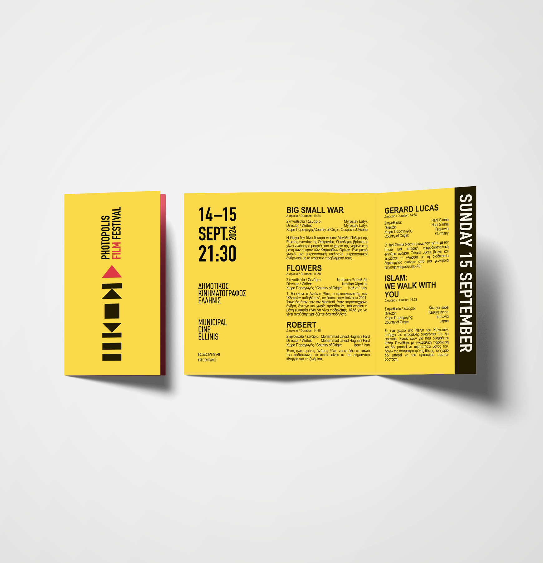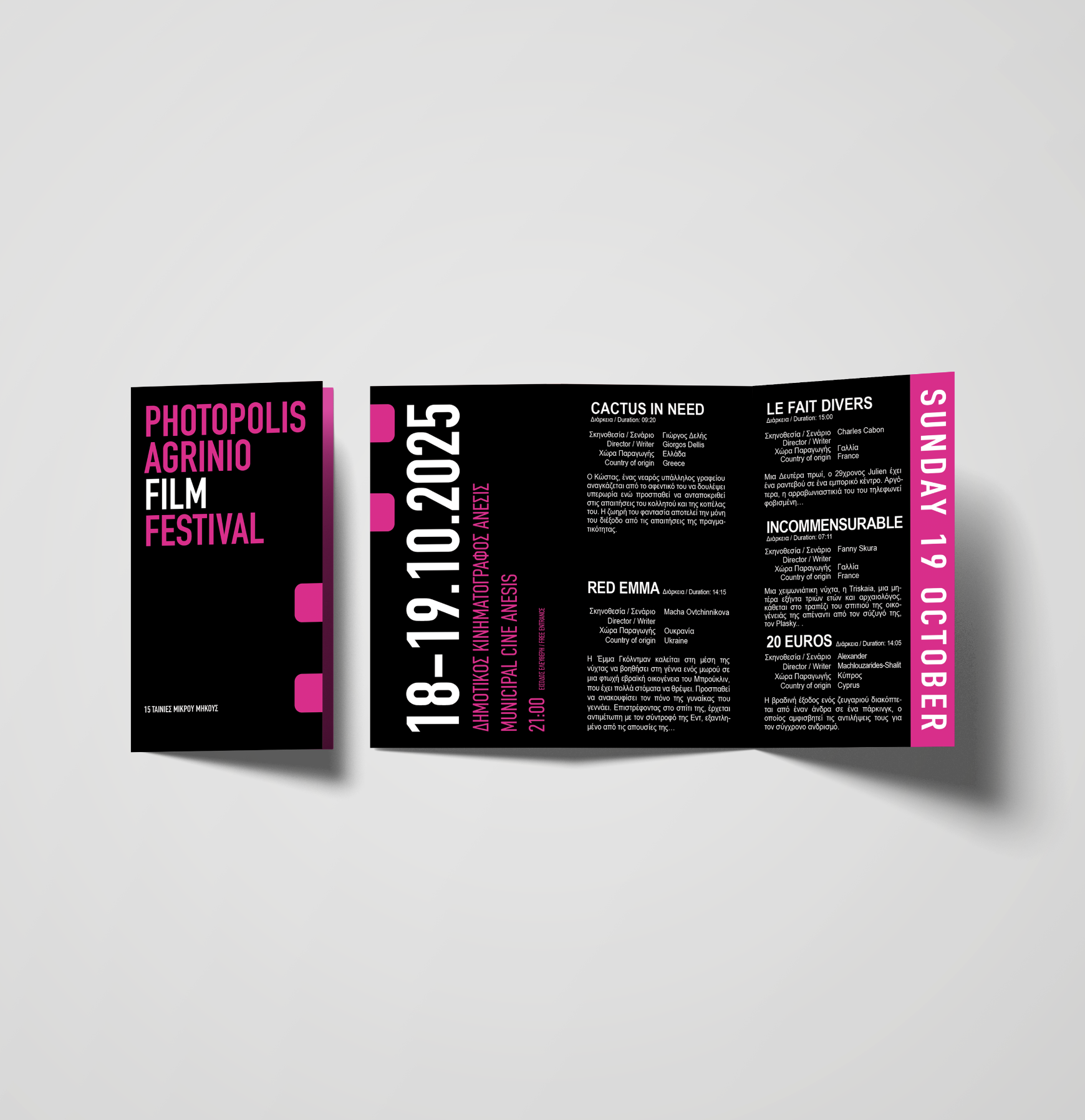 The visual identities for Photopolis Agrinio Photo Festival and Photopolis Film Festival emphasize the distinctive photographic and cinematic character of each event. A bold signature color acts as a visual cue, ensuring instant recognition. Together, the colors create contrast, energy, and aesthetic coherence, while maintaining flexibility across print and digital applications, including catalogs, programs, posters, and social media.